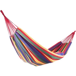 Dwuosobowy hamak ogrodowy na taras, do sadu lub na piknik nad wodą. Mocny materiał bawełniany jest ciepły i miękki w dotyku oraz zapewnia wytrzymałość do 200kg. Umożliwia przyjemny wypoczynek w upalne dni lub stanowi świetne miejsce do czytania książki