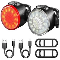 Komplet lekkich ładowalnych lampek rowerowych na przód i tył. W zestawie znajdują się lampka biała i czerwona. Zasilane są z wbudowanych akumulatorów ładowanych przez USB i świecą światłem ciągłym do 40 godzin lub błyskają do 120 godzin