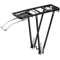 Bagażnik do roweru montowany do sztycy siodełka, wyposażony dodatkowo w regulowane wsporniki mocowane do tylnego widelca. Pasuje do rowerów z kołami średnicy 26-28 cali, nawet do tych bez gwintowanych otworów w ramie przewidzianych pod bagażnik.