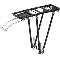 Regulowany bagażnik rowerowy pasujący do rowerów z kołami średnicy 26-28 cali. Wyposażony w metalowe zaczepy do zapięcia sakw wyprawowych. U góry może być montowany do bocznych otworów w ramie lub do otworu na śrubę błotnika.