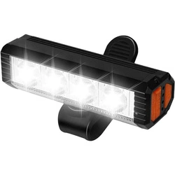 Mocna panelowa lampa rowerowa na przód z dodatkową funkcją niebiesko-czerwonej błyskającej lampy policyjnej i powerbanku. Wbudowany akumulator litowo-jonowy ładowany przez USB. Oświetla drogę, ostrzega i ładuje telefon, licznik, smartwatch lub nawigację.