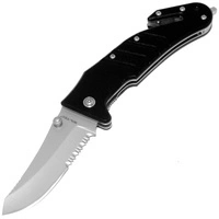 Nowoczesny nóż taktyczny z mechanizmem półautomatycznym umożliwiającym szybkie rozłożenie ostrza w jednej dłoni. Zaopatrzony w ratownicze dodatkowe ostrze do cięcia pasów bezpieczeństwa i zbijak do samochodowych szyb hartowanych.