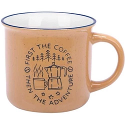 Porcelanowy kubek turystyczny z grafiką zachęcającą do relaksującej kawy w terenie. Oryginalny upominek dla pasjonatów bushcraftu. Wykonany nie z odpornej na ścieranie wysokiej jakości porcelany typu New Bone. Pojemność 350ml.