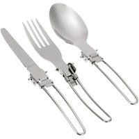 Komplet składanych sztućców turystycznych zawierający łyżkę, widelec oraz nóż. Wykonane z wysokiej jakości polerowanej stali nierdzewnej. Składane uchwyty pozwalają zaoszczędzić miejsce w kieszeni lub w plecaku. W zestawie praktyczny pokrowiec