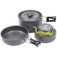 Komplet naczyń turystycznych z czajnikiem wykonanych z anodyzowanego aluminium. W zestawie znajduje się rondel z pokrywką, patelnia ze składanymi uchwytami i czajnik do gotowania wody. Przystosowany do kuchenek gazowych, benzynowych i spirytusowych.