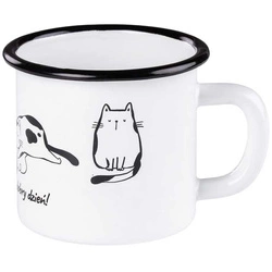 Kubek turystyczny ze stali emaliowanej z kotami życzącymi miłego dnia. Oryginalny upominek dla posiadaczy i miłośników kotów. Stworzony jako naczynie do picia, podgrzewania i gotowania. Pojemność użytkowa 380ml.