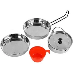 Jednoosobowy komplet naczyń turystycznych dla każdego miłośnika biwakowania. W skład zestawu wchodzi menażka z pokrywką i kabłąkiem umożliwiającym wieszanie nad ogniem, patelnia ze składanym uchwytem, talerz i kubek