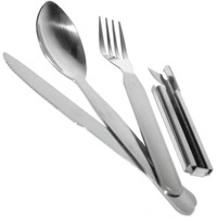 Sztućce turystyczne wykonane ze stali nierdzewnej. W skład kompletu wchodzą: łyżka, widelec, nóż i otwieracz do konserw. Zestaw składa się w jedną całość do transportu, łatwo mieszcząc się do plecaka.