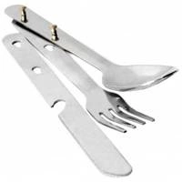 Sztućce turystyczne wykonane ze stali nierdzewnej. Komplet zawiera: łyżkę, widelec i nóż. Całość wygodnie spina się do transportu, łatwo mieszcząc się nawet w wąskiej kieszeni plecaka.