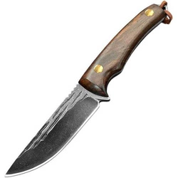 Poręczny nóż myśliwski o wytrzymałej konstrukcji typu full tang. Solidny model do pracy w obozowej kuchni i drobnych prac w drewnie. Głownia długości 95mm wykonana z kutej stali nierdzewnej grubości 4mm stanowi z rdzeniem rękojeści jeden płat metalu.