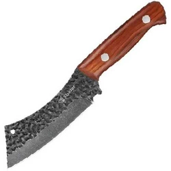 Poręczny tasak myśliwski o wytrzymałej konstrukcji typu full tang. Głownia długości 115mm wykonana z kutej stali nierdzewnej grubości 4mm stanowi z rdzeniem rękojeści jeden płat metalu. Otwór w głowni może służyć jako klucz 5mm lub do gięcia drutu.