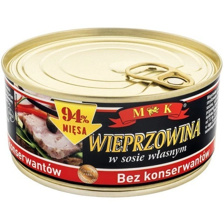 Wieprzowina w sosie własnym bez konserwantów MK to konserwa z półki premium, odrobinę droższa, ale za to przygotowana tylko z naturalnych składników - 94% mięsa wieprzowego oraz 6% naturalnych przypraw dla smaku i aromatu.