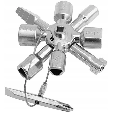 - Uniwersalny klucz do otwierania skrzynek i pomieszczeń technicznych. Niezastąpione narzędzie w awaryjnych sytuacjach, gdy trzeba dostać się do tablic rozdzielczych, węzłów ciepłowniczych, sanitarnych i elektrycznych. Zastępuje 14 różnych narzędzi.