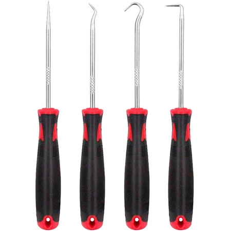 - Zestaw 4 stalowych zaostrzonych haków z uchwytami stworzonych specjalnie do zdejmowania trudno dostępnych uszczelek i oringów. Sięgają w ciasne zakamarki urządzeń. Niezbędne narzędzia w każdym warsztacie samochodowym, serwisie AGD i elektronarzędzi