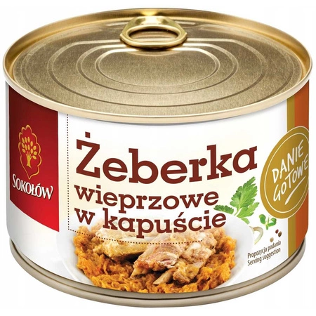 Składniki żeberek wieprzowych z kapustą Sokołów: kapusta kwaszona (kapusta, marchew, sól, przyprawy), żeberka wieprzowe (100g wyprodukowano z 69g kapusty i 37g żeberek), tłuszcz wieprzowy, mąka pszenna, sól spożywcza, koncentrat pomidorowy, przyprawy, warzywa suszone w zmiennych proporcjach, (cebula, marchew, pasternak, seler), wzmacniacze smaku: E621, E635; cukier, aromat, skrobia kukurydziana, barwnik: E101, ocet, glukoza.