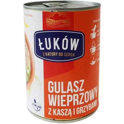 Składniki gulaszu wieprzowego z kaszą i grzybami Łuków: woda, mięso wieprzowe (30%), warzywa (5,2%): cebula, marchew, pietruszka, seler; kasza gryczana (4,1%), mąka pszenna (zawiera gluten), grzyby suszone (2,5%), przyprawy, cukier, glukoza, dekstroza, zioła, śmietanka, białka mleka, błonnik pszenny bezglutenowy, łupina nasienna babki jajowatej, inulina, sól, skrobia ziemniaczana, olej rzepakowy, aromaty. Produkt może zawierać: gluten, mleko, gorczycę, seler, soję.
