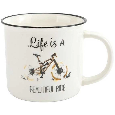 Rant kubka rower MTB Life Is A Beautiful Ride pokryty został czarną emalią i opatrzony kolorową grafiką przedstawiającą rower MTB.